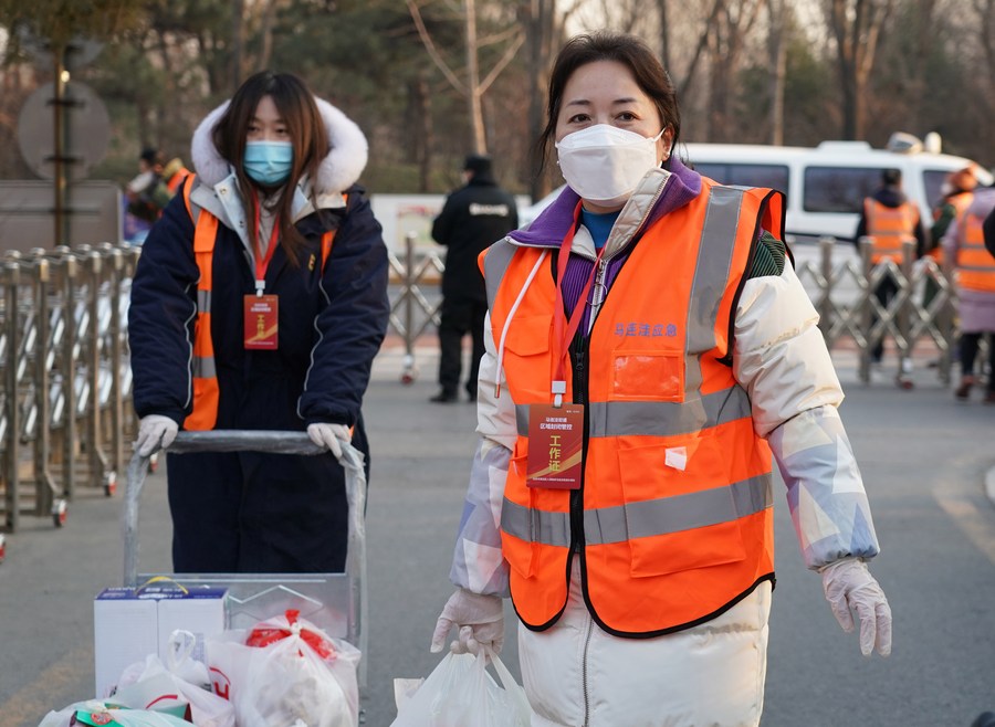 Staff members deliver daily necessities ordered by residents in quarantine at a community under close-off management where a locally transmitted COVID-19 case was found in Haidian District of Beijing, capital of China, Jan. 18, 2022. (Xinhua/Ren Chao)