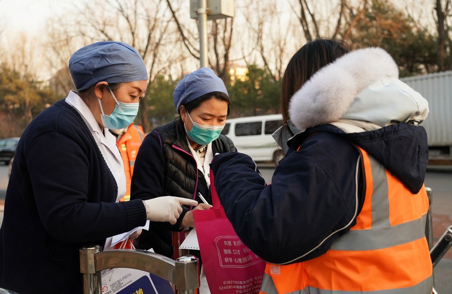 Medical workers deliver medicine for the elderly in quarantine at a community under close-off management where a locally transmitted COVID-19 case was found in Haidian District of Beijing, capital of China, Jan. 18, 2022. (Xinhua/Ren Chao)