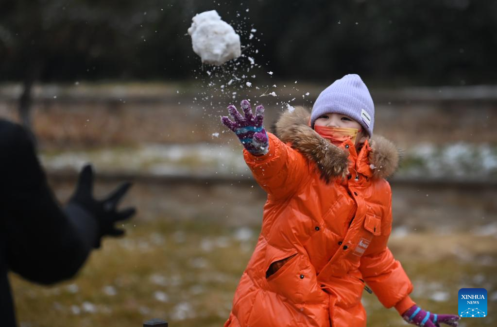 A child plays with snow on the street in Xi'an, northwest China's Shaanxi Province, Jan. 23, 2022. (Xinhua/Tao Ming)