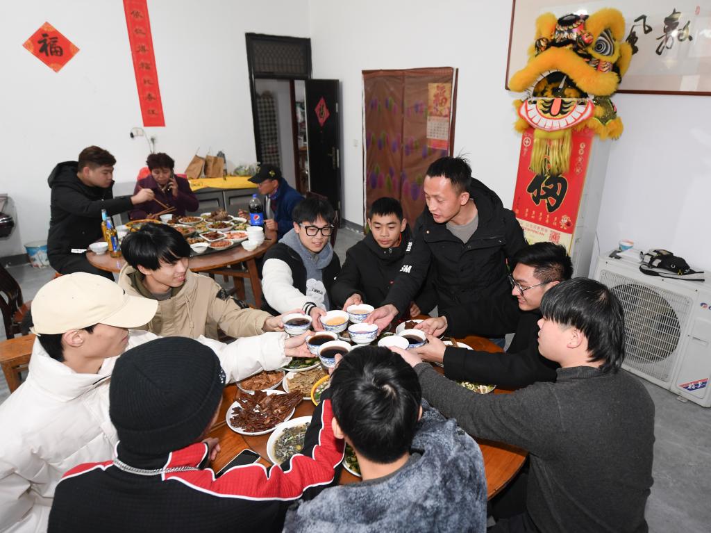 Tong Panfeng (3rd, R) and members of a lion dance team gather for a meal at his house in Qiantong ancient town in Ninghai County, east China's Zhejiang Province, Jan. 21, 2022. Tong Panfeng is an enthusiast of lion dance. At the age of 26, he quit his job to learn lion dance all over the country. In 2016, with the support of the local government, Tong returned to his hometown to promote the lion dance into school activities with an aim to help primary and middle school students keep fit and inherit the traditional culture. Thanks to the efforts of Tong, many local primary and middle school students joined the lion dance team of the town and they often practice lion dance in their spare time. In recent years, this team has achieved good results in provincial and national championships for many times.Lion dance is not only a sport but also a cultural tradition which has made the the ancient town full of vitality. (Xinhua/Weng Xinyang)