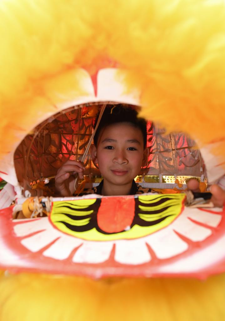 Zhang Zhenhao, 13, a member of a lion dance team, poses for a photo during a training at Qiantong ancient town in Ninghai County, east China's Zhejiang Province, Jan. 20, 2022. Tong Panfeng is an enthusiast of lion dance. At the age of 26, he quit his job to learn lion dance all over the country. In 2016, with the support of the local government, Tong returned to his hometown to promote the lion dance into school activities with an aim to help primary and middle school students keep fit and inherit the traditional culture. Thanks to the efforts of Tong, many local primary and middle school students joined the lion dance team of the town and they often practice lion dance in their spare time. In recent years, this team has achieved good results in provincial and national championships for many times.Lion dance is not only a sport but also a cultural tradition which has made the the ancient town full of vitality.(Xinhua/Weng Xinyang)