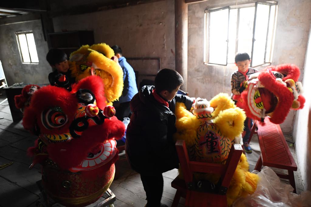 Young members of a lion dance team prepare for training at Qiantong ancient town in Ninghai County, east China's Zhejiang Province, Jan. 21, 2022. Tong Panfeng is an enthusiast of lion dance. At the age of 26, he quit his job to learn lion dance all over the country. In 2016, with the support of the local government, Tong returned to his hometown to promote the lion dance into school activities with an aim to help primary and middle school students keep fit and inherit the traditional culture. Thanks to the efforts of Tong, many local primary and middle school students joined the lion dance team of the town and they often practice lion dance in their spare time. In recent years, this team has achieved good results in provincial and national championships for many times.Lion dance is not only a sport but also a cultural tradition which has made the the ancient town full of vitality.(Xinhua/Weng Xinyang)