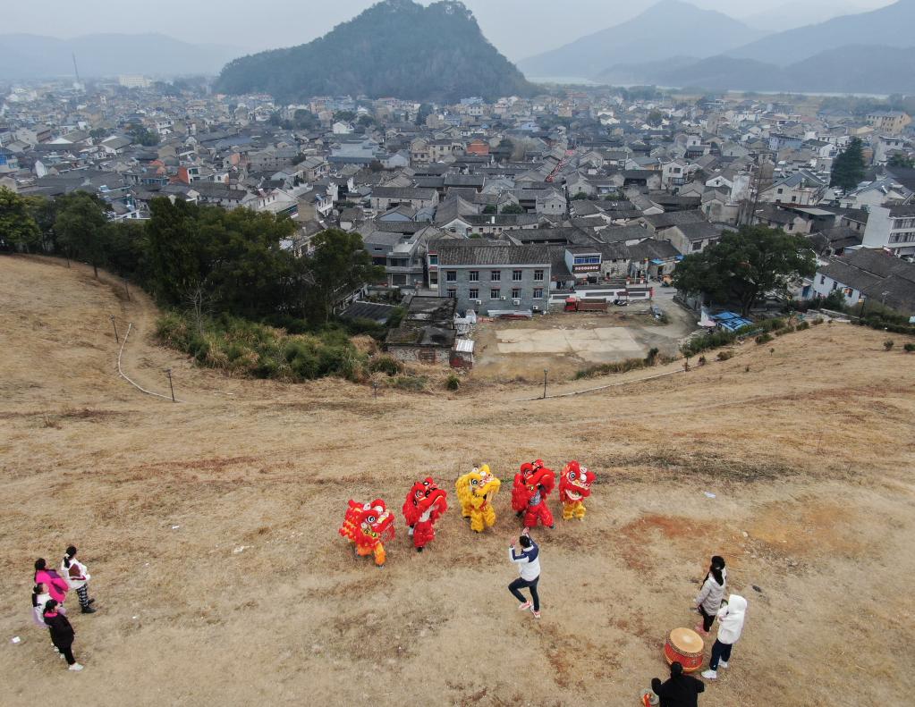 In this aerial photo, Tong Panfeng instructs members of a lion dance team during a training near Qiantong ancient town in Ninghai County, east China's Zhejiang Province, Jan. 20, 2022. Tong Panfeng is an enthusiast of lion dance. At the age of 26, he quit his job to learn lion dance all over the country. In 2016, with the support of the local government, Tong returned to his hometown to promote the lion dance into school activities with an aim to help primary and middle school students keep fit and inherit the traditional culture. Thanks to the efforts of Tong, many local primary and middle school students joined the lion dance team of the town and they often practice lion dance in their spare time. In recent years, this team has achieved good results in provincial and national championships for many times.Lion dance is not only a sport but also a cultural tradition which has made the the ancient town full of vitality. (Xinhua/Weng Xinyang)