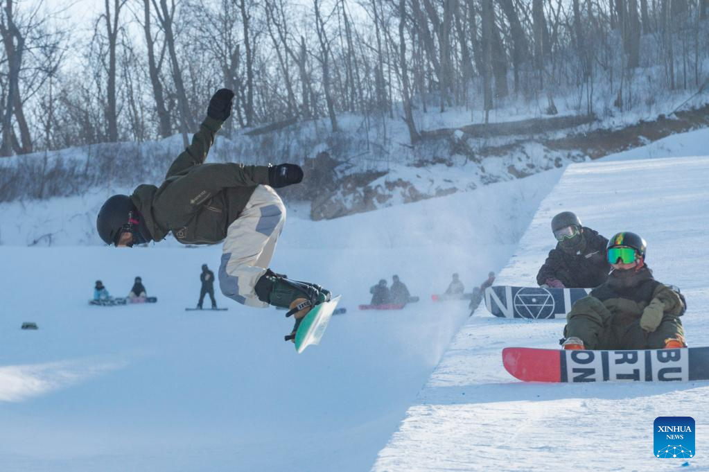 Skiers from Heilongjiang Province participate in a training session at Yabuli Ski Resort in Harbin, northeast China's Heilongjiang Province, Jan. 21, 2022. Yabuli, located in northeastern China, is the cradle of Chinese winter sports. Boasting of professional ski area, Yabuli Resort hosted many national, continental and international winter games like FIS snowboard world cup, World Winter Universiade and the Asian Winter Games. (Xinhua/Xie Jianfei)