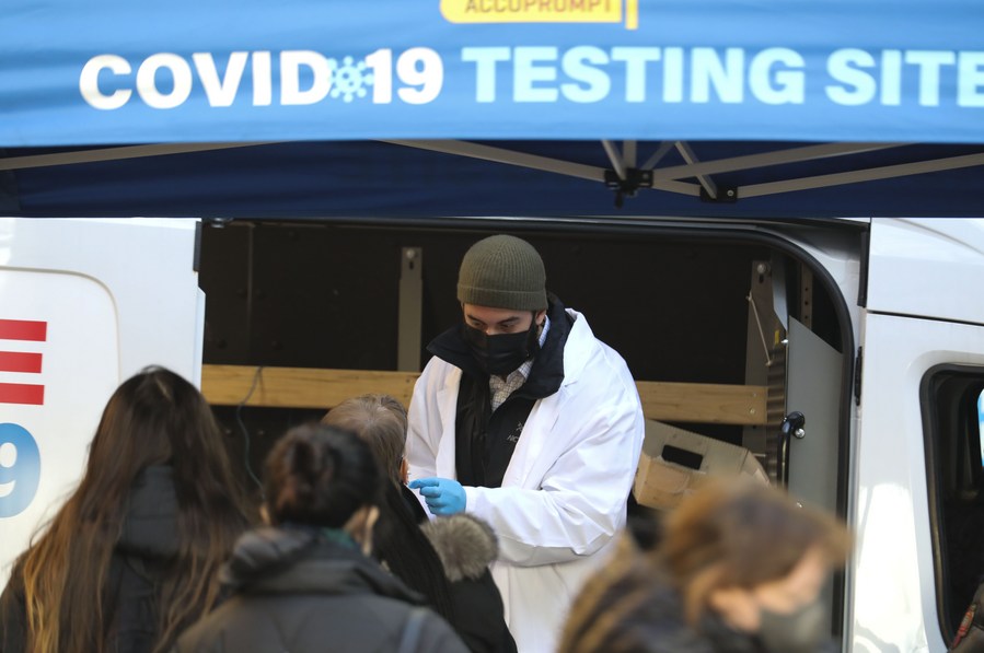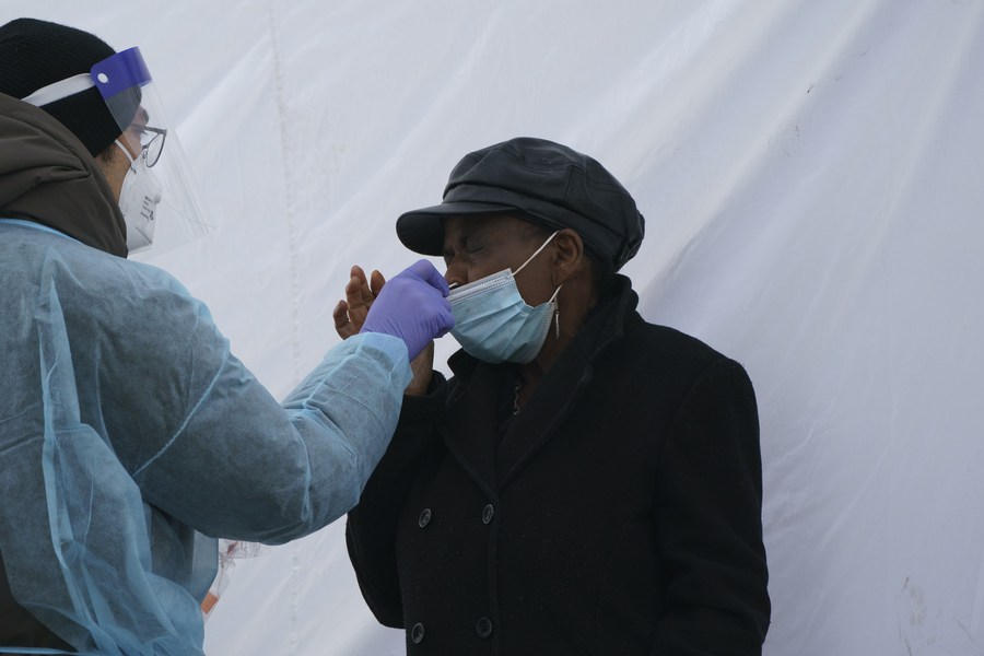 A medical worker wearing a face mask collects a sample at a COVID-19 testing site in Manhattan of New York, the United States, Jan. 19, 2022. (Xinhua/Wang Ying)