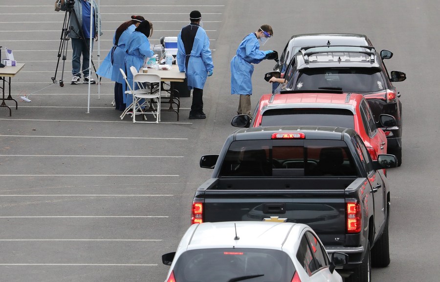Medical workers collect swab samples at a COVID-19 drive-through testing site in Los Angeles, California, the United States, Jan. 10, 2022. (Xinhua)