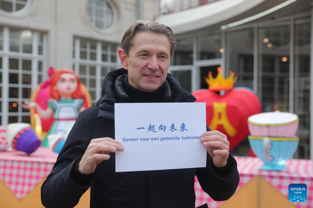 Dries Herpoelaert, general director of Royal Zoological Society of Antwerp, poses with a piece of paper printing "Together for a Shared Future", the official motto for Beijing 2022, in Antwerp, Belgium, on Jan. 12, 2022. With less than two weeks to go before the start of the 2022 Winter Olympics in Beijing, people around the world are eagerly expressing their joy over the sporting extravaganza. (Xinhua/Zheng Huansong)