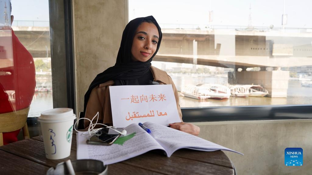 Narjis, a law school student, poses with a piece of paper printing "Together for a Shared Future", the official motto for Beijing 2022, in Cairo, Egypt, on Jan. 18, 2022. With less than two weeks to go before the start of the 2022 Winter Olympics in Beijing, people around the world are eagerly expressing their joy over the sporting extravaganza. (Xinhua/Wang Dongzhen)