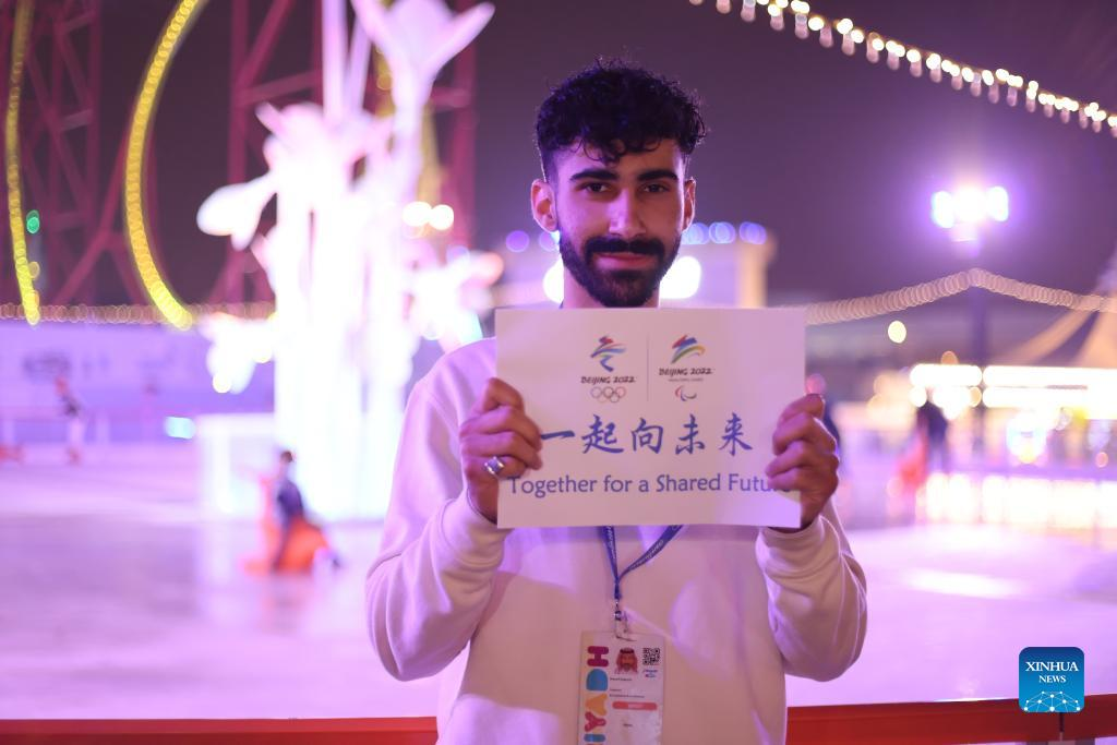 Skating coach Abdulrhman poses with a piece of paper printing "Together for a Shared Future", the official motto for Beijing 2022, in Riyadh, Saudi Arabia, on Jan. 17, 2022. With less than two weeks to go before the start of the 2022 Winter Olympics in Beijing, people around the world are eagerly expressing their joy over the sporting extravaganza. (Xinhua/Wang Haizhou)