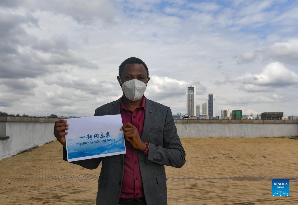 Peter Gikonyo, a teacher of Nairobi University, poses with a piece of paper printing "Together for a Shared Future", the official motto for Beijing 2022, in Nairobi, Kenya, on Jan. 17, 2022. With less than two weeks to go before the start of the 2022 Winter Olympics in Beijing, people around the world are eagerly expressing their joy over the sporting extravaganza. (Xinhua/Li Yan)
