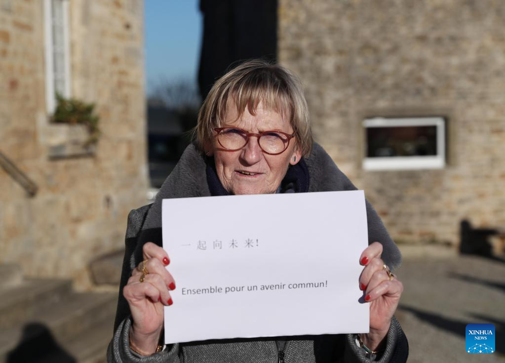 Colette Jeanne from France poses with a piece of paper printing "Together for a Shared Future", the official motto for Beijing 2022, in Meautis, Manche, France, on Jan. 14, 2022. With less than two weeks to go before the start of the 2022 Winter Olympics in Beijing, people around the world are eagerly expressing their joy over the sporting extravaganza. (Xinhua/Gao Jing)
