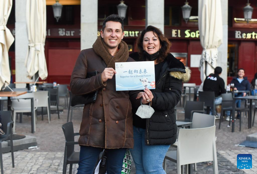 Opera actor Jorge Rodriguez-Norton (L) and actress Carmen Solis pose with a piece of paper printing "Together for a Shared Future", the official motto for Beijing 2022, in Madrid, Spain, on Jan. 18, 2022. With less than two weeks to go before the start of the 2022 Winter Olympics in Beijing, people around the world are eagerly expressing their joy over the sporting extravaganza. (Xinhua/Meng Dingbo)