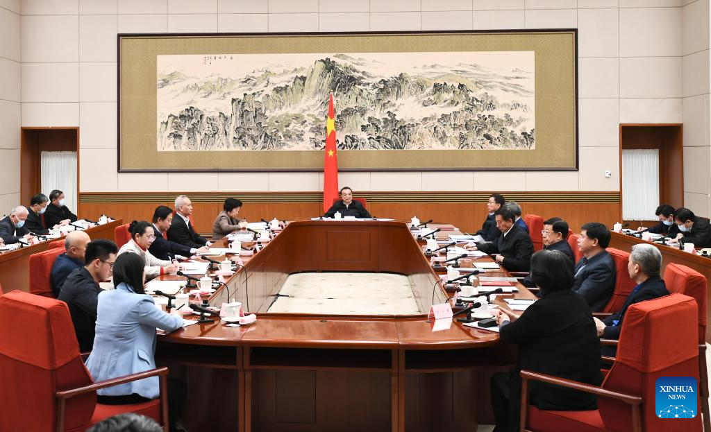 Chinese Premier Li Keqiang, a member of the Standing Committee of the Political Bureau of the Communist Party of China (CPC) Central Committee, makes exchanges with representatives from the education, science and technology, culture, health, and sports sectors at a symposium to hear their opinions on a draft government work report on Jan. 21, 2022. Chinese Vice Premier Han Zheng, also a member of the Standing Committee of the Political Bureau of the CPC Central Committee, attended the symposium. (Xinhua/Xie Huanchi)