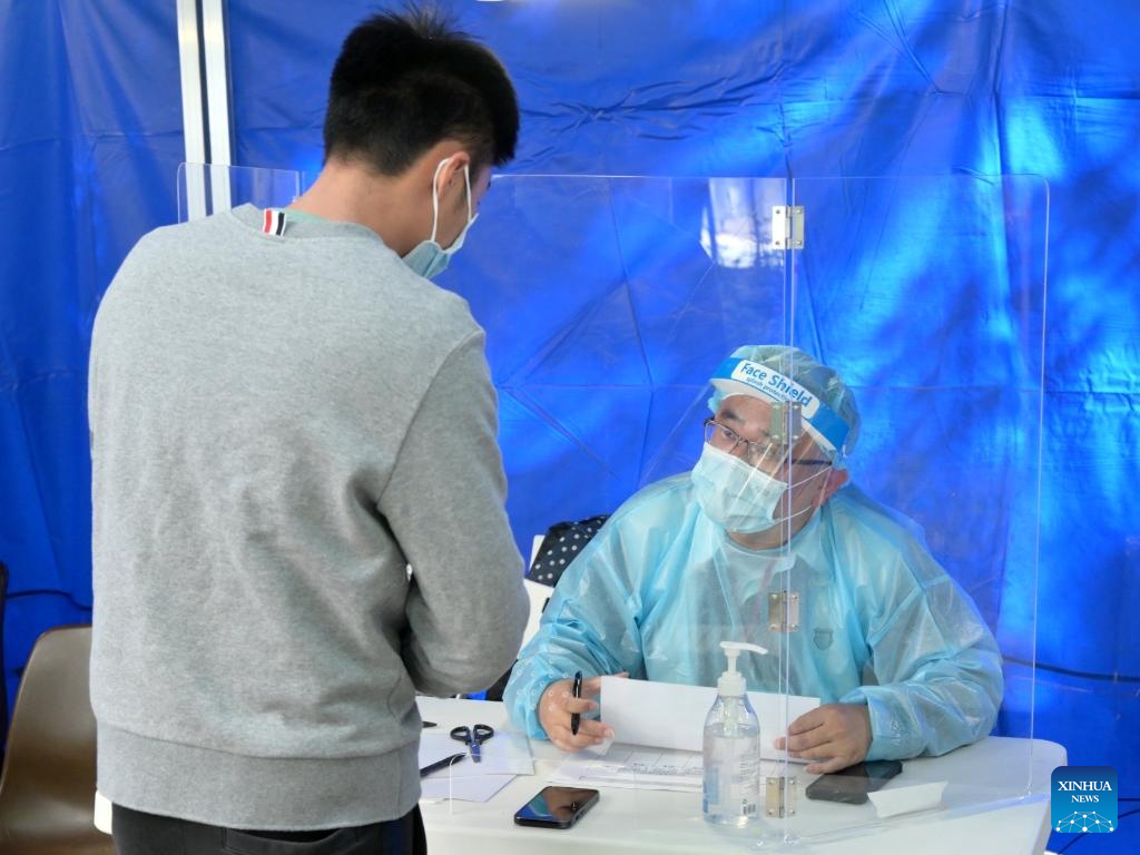 A resident registers personal information in Kwai Chung of Hong Kong, south China, Jan. 23, 2022. Hong Kong reported 140 new cases of COVID-19 over the past 24 hours on Sunday, taking the total tally to 13,286, according to data from the Center for Health Protection. (Xinhua)