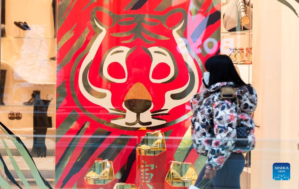 A woman wearing a face mask walks past decorations marking the upcoming Chinese Lunar New Year at a shopping center in Toronto, Canada, on Jan. 22, 2022. (Photo by Zou Zheng/Xinhua)