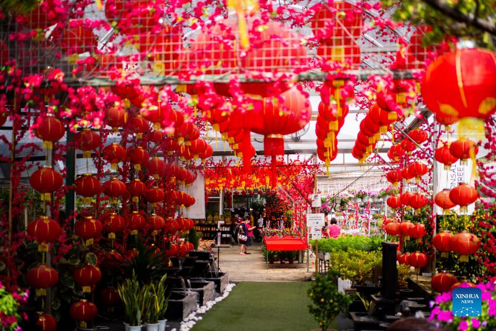 People buy plants for Chinese New Year at a plant shop near Kuala Lumpur, Malaysia, Jan. 23, 2022. People decorate their houses with plants and flowers as well as traditional decorations such as red lanterns and couplets as the Chinese New Year draws closer. (Xinhua/Zhu Wei)