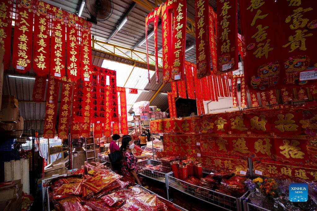 People buy couplets for Chinese New Year at a store in Kuala Lumpur, Malaysia, Jan. 23, 2022. People decorate their houses with plants and flowers as well as traditional decorations such as red lanterns and couplets as the Chinese New Year draws closer. (Xinhua/Zhu Wei)