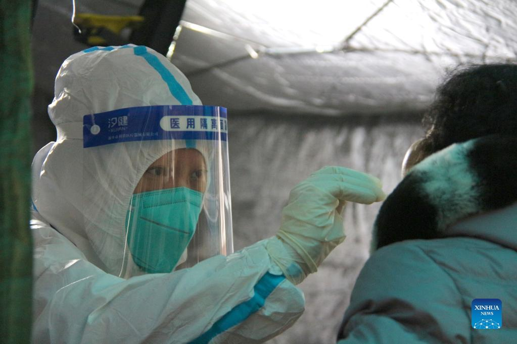 A medical worker takes a swab sample from a resident for nucleic acid test at a COVID-19 testing site in Fengtai District in Beijing, capital of China, Jan. 23, 2022.(Xinhua/Tang Rufeng)