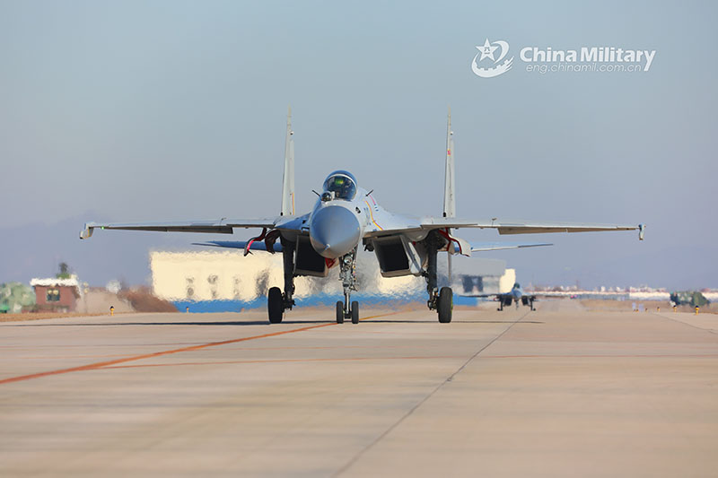 A fighter jet attached to the PLA Naval Aviation University taxis down the runway during flight training on January 6, 2022. (eng.chinamil.com.cn/Photo by Jiang Tao)