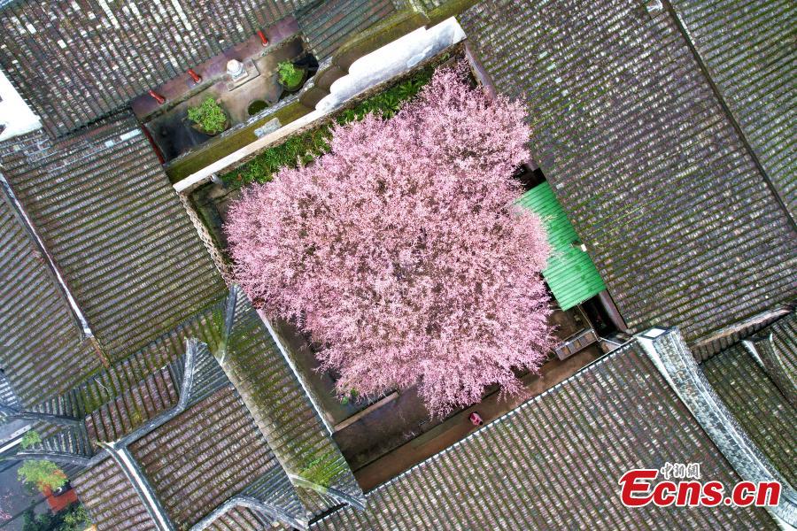 Aerial photo shows plum trees nestled among several ancient buildings in the Linyang Temple in the Jin'an Districtof Fuzhou, Fujian Province, Jan. 23, 2022. (Photo: China News Service/Wang Dongming)