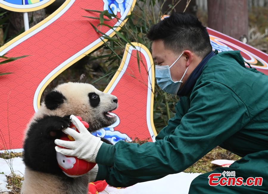 Photo taken on Jan. 24, 2022 shows a giant panda cub at the Shenshuping base of China Conservation and Research Center for Giant Panda, southwest China's Sichuan Province. (Photo: China News Service/An Yuan)