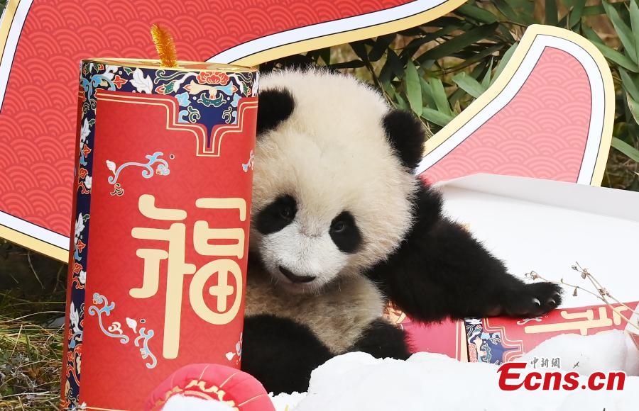 Photo taken on Jan. 24, 2022 shows a giant panda cub at the Shenshuping base of China Conservation and Research Center for Giant Panda, southwest China's Sichuan Province. (Photo: China News Service/An Yuan)