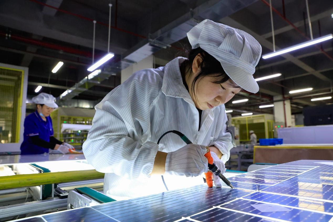 Technical workers of an energy technology company based in Luyang district, Hefei city, capital of east China’s Anhui province, produce smart solar modules to be exported to overseas markets, Dec. 24, 2021. (People’s Daily Online/ Zhao Ming)
