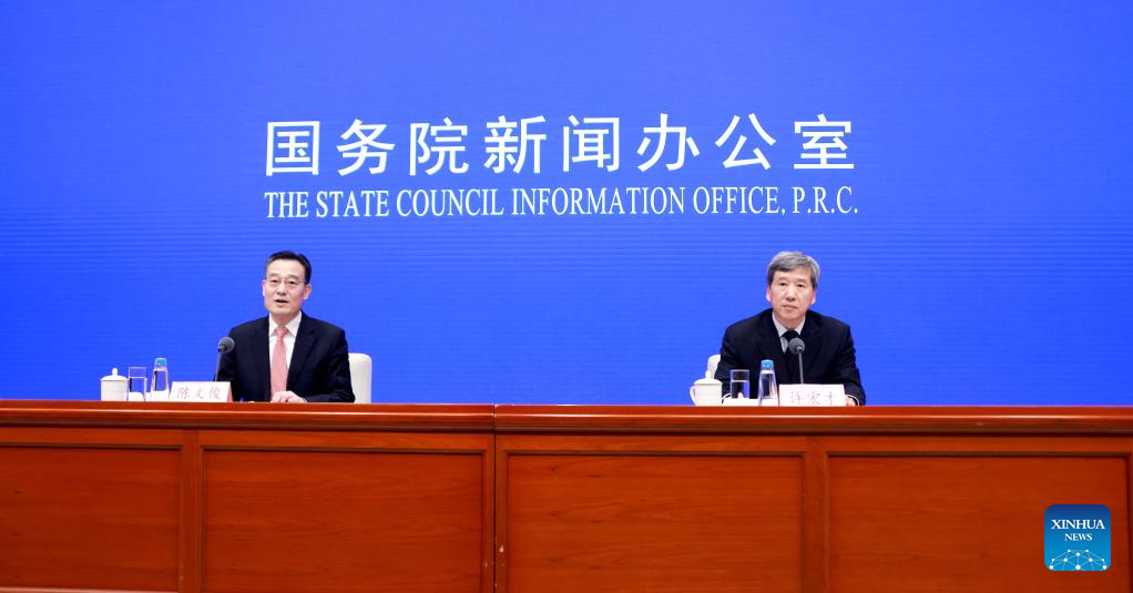 Xu Hongcai (R), vice minister of finance, attends a press conference held by the State Council Information Office on China's fiscal revenue and spending in 2021, in Beijing, capital of China, Jan. 25, 2022. (Xinhua/Pan Xu)