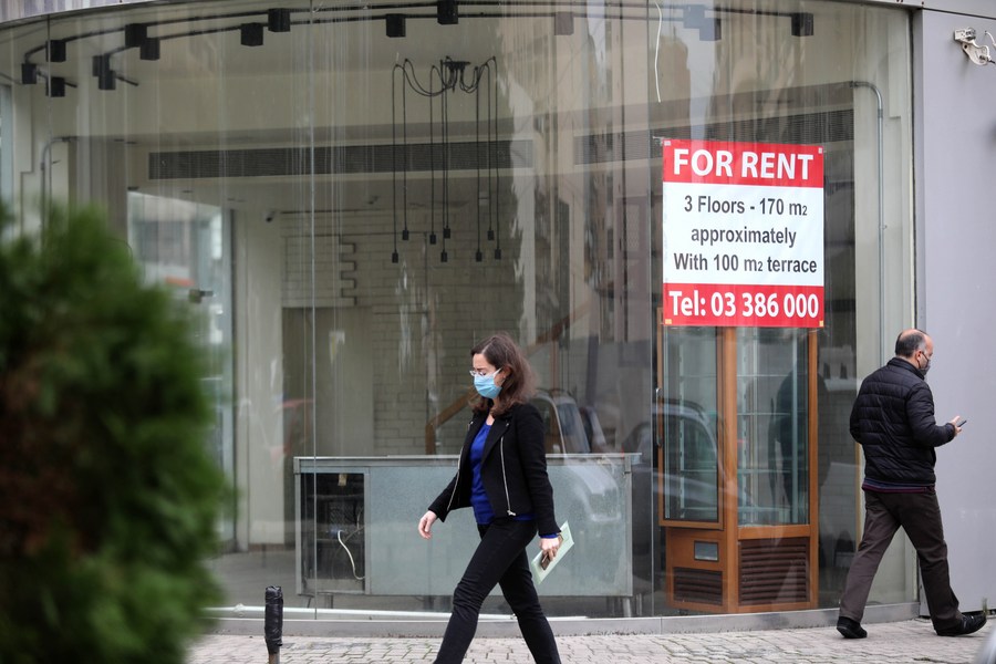 People walk past a place for rent in Beirut, Lebanon, on Jan. 10, 2022. Lebanon's merchants took a hit in 2021 by unprecedented economic and financial crisis with 35 percent of them shutting down their stores. (Xinhua/Bilal Jawich)