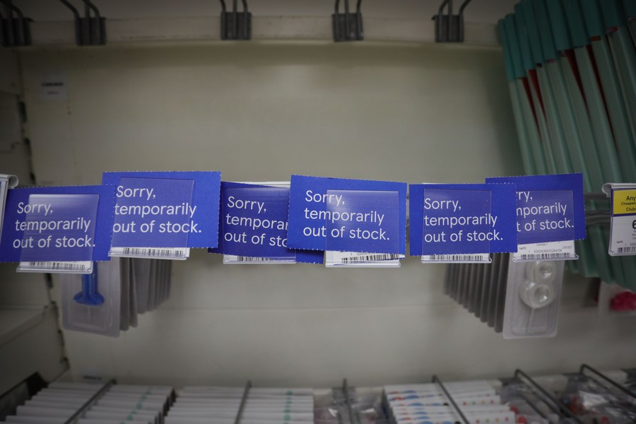 Photo taken on Nov. 24, 2021 shows signs of products out of stock at a store in London, Britain. (Photo by Tim Ireland/Xinhua)