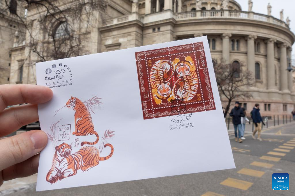 A first day cover with stamps for the Year of the Tiger is seen in front of a post office in Budapest, Hungary on Jan. 25, 2022. A special zodiac stamp issued by the Hungarian Post to celebrate the Chinese New Year of the Tiger was presented to the public in Hungary on Tuesday. (China Cultural Center in Budapest/Handout via Xinhua)