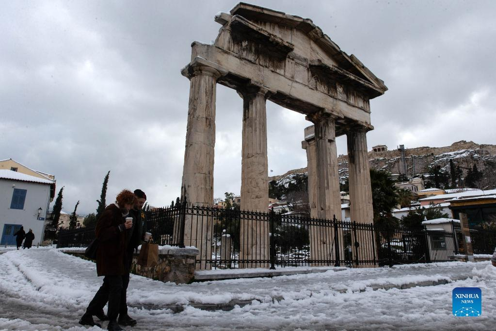 People walk on a snow-covered street at the foot of Acropolis in Athens, Greece, on Jan. 25, 2022. Much of Greece was paralyzed on Tuesday for a second day after heavy snowfall caused hours of travel disruptions and power cuts. (Xinhua/Marios Lolos)
