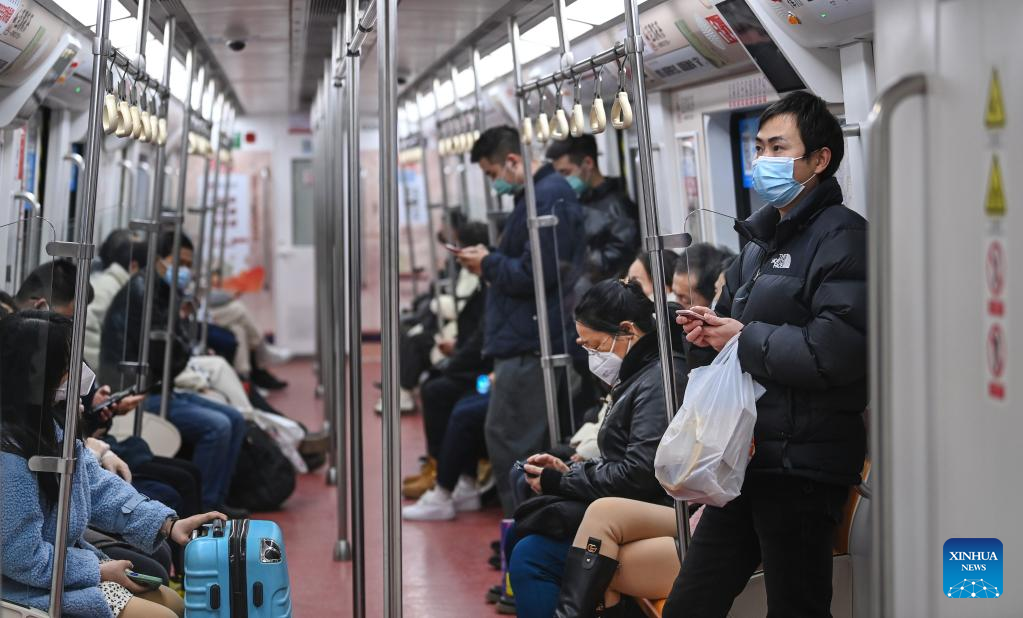 Passengers are seen on a metro train in Xi'an, northwest China's Shaanxi Province, Jan. 25, 2022. Xi'an cleared all areas classified as high and medium-risk for COVID-19 on Jan. 24. (Xinhua/Tao Ming)