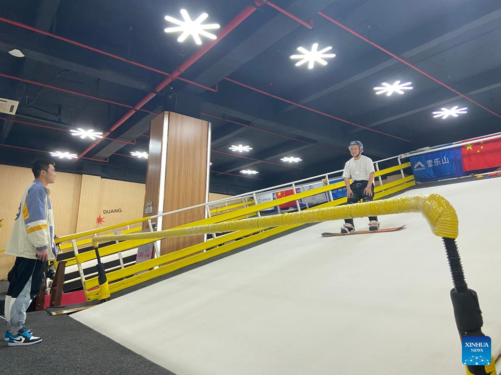 A learner practices on an indoor artificial ski slope in Haikou, capital of south China's Hainan Province, Jan. 15, 2022. The Beijing 2022 Olympic Winter Games are scheduled from Feb. 4 to 20, followed by the Paralympics, and have stirred up passion for winter sports in China. Even people in China's warm areas, such as Hainan, have started participating in ice-snow sports. (Xinhua/Chen Ziwei)