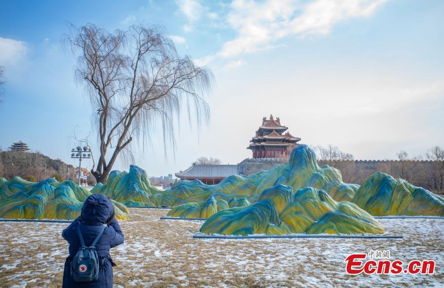 Elements in "A Panorama of Rivers and Mountains," a 12-meter-long landscape painting created in 1096, are installed before Palace Museum in Beijing, capital of China, Jan. 25, 2022. (Photo: China News Service/Hou Yu)