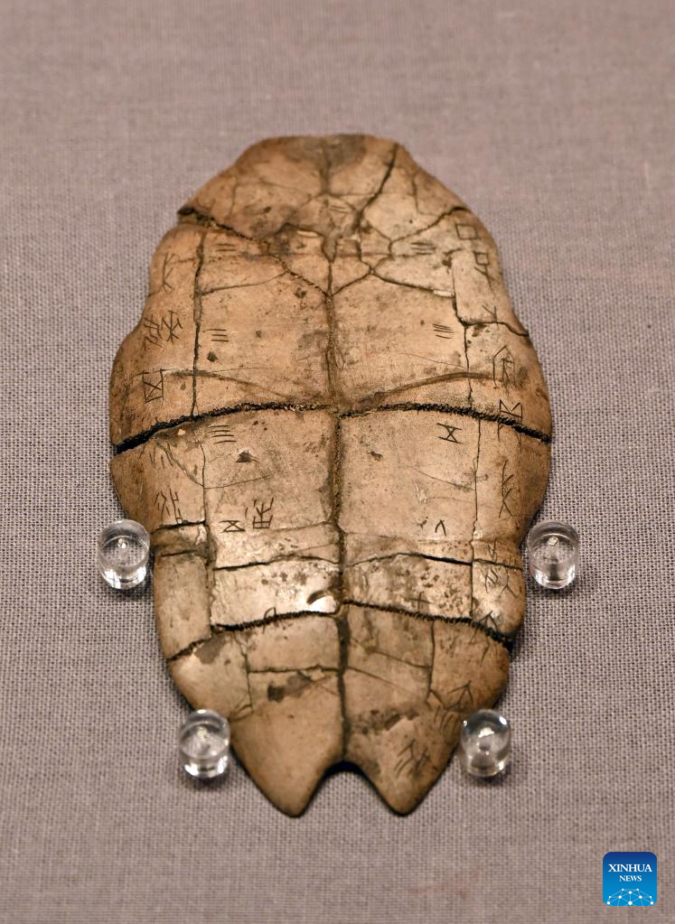 Photo taken on Jan. 25, 2022 shows a piece of tortoise shell carrying inscriptions during an exhibition held at the Palace Museum in Beijing, capital of China.(Xinhua/Jin Liangkuai)