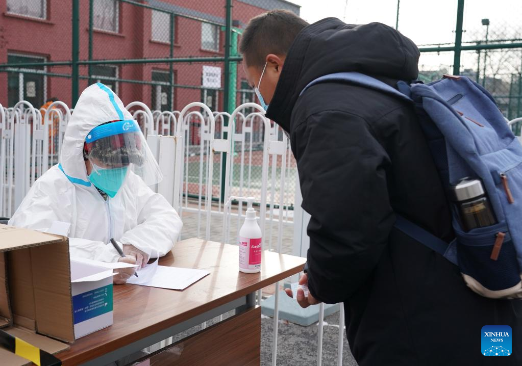 A staff member registers information of a resident at a COVID-19 testing site in Xicheng District in Beijing, capital of China, Jan. 26, 2022. (Xinhua/Ren Chao)