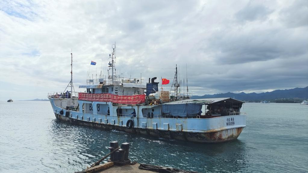 A vessel carrying the emergency aid from China to Tonga is to set off at a port in Suva's Walu Bay, Fiji, Jan. 24, 2022. (Xinhua/Zhang Yongxing)