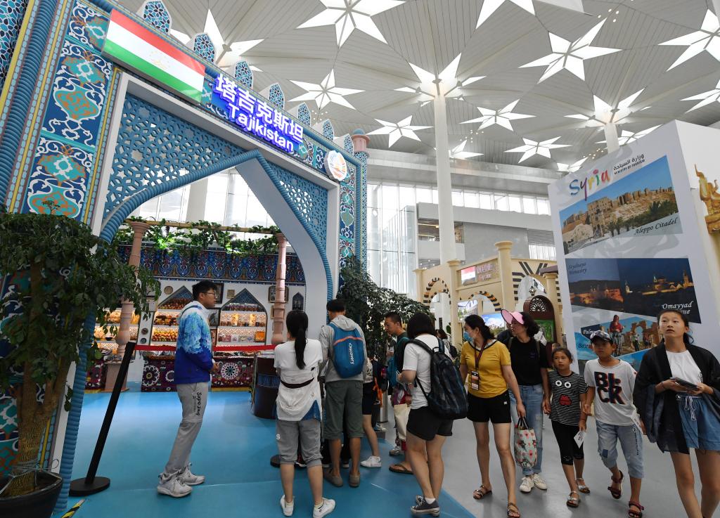Tourists visit the exhibition zone of Tajikistan during the "Tajikistan Day" event at the Beijing International Horticultural Exhibition in Beijing, capital of China, Aug. 20, 2019. (Xinhua/Zhang Chenlin)