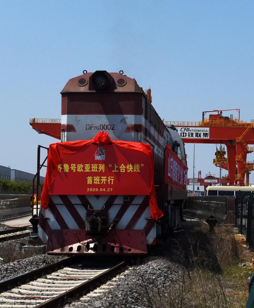 A freight train departs for Almaty of Kazakhstan, at a transit center in Jiaozhou, east China's Shandong Province, April 27, 2020. (Xinhua/Wang Zhaomai)