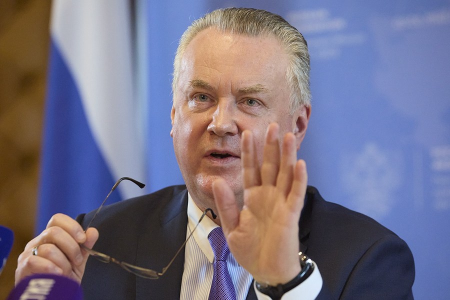 Alexander Lukashevich, Russia's permanent representative to the Organization for Security and Cooperation in Europe (OSCE), speaks to reporters in Vienna, Austria, Jan. 13, 2022. (Photo by Georges Schneider/Xinhua)