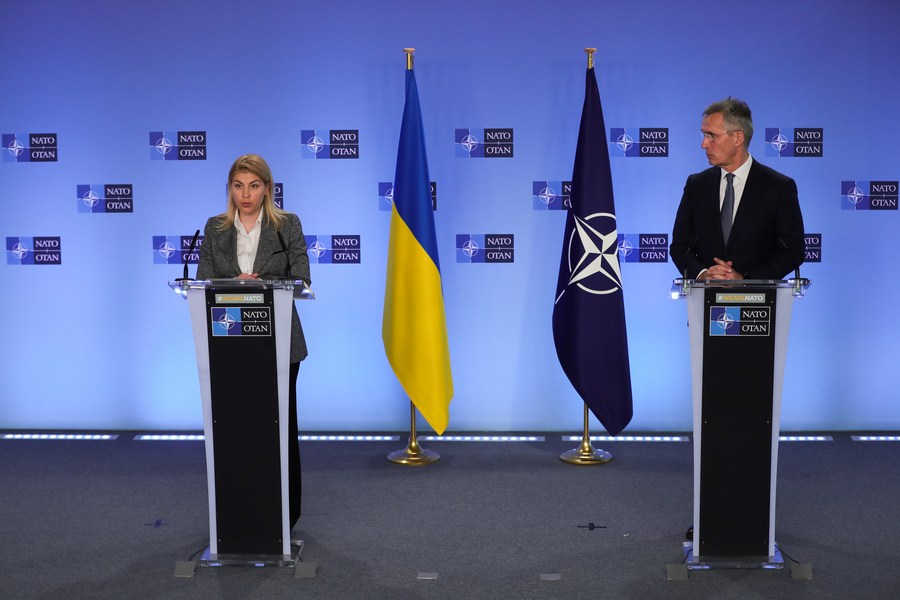 NATO Secretary General Jens Stoltenberg (R) and Ukraine's Deputy Prime Minister for European and Euro-Atlantic Integration Olha Stefanishyna attend a joint press point at NATO Headquarters before the meeting of the NATO-Ukraine Commission, Brussels, Belgium, Jan. 10, 2022. (Xinhua/Zheng Huansong)