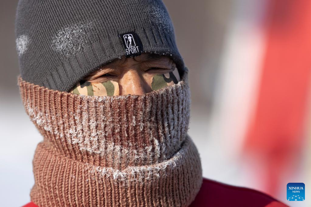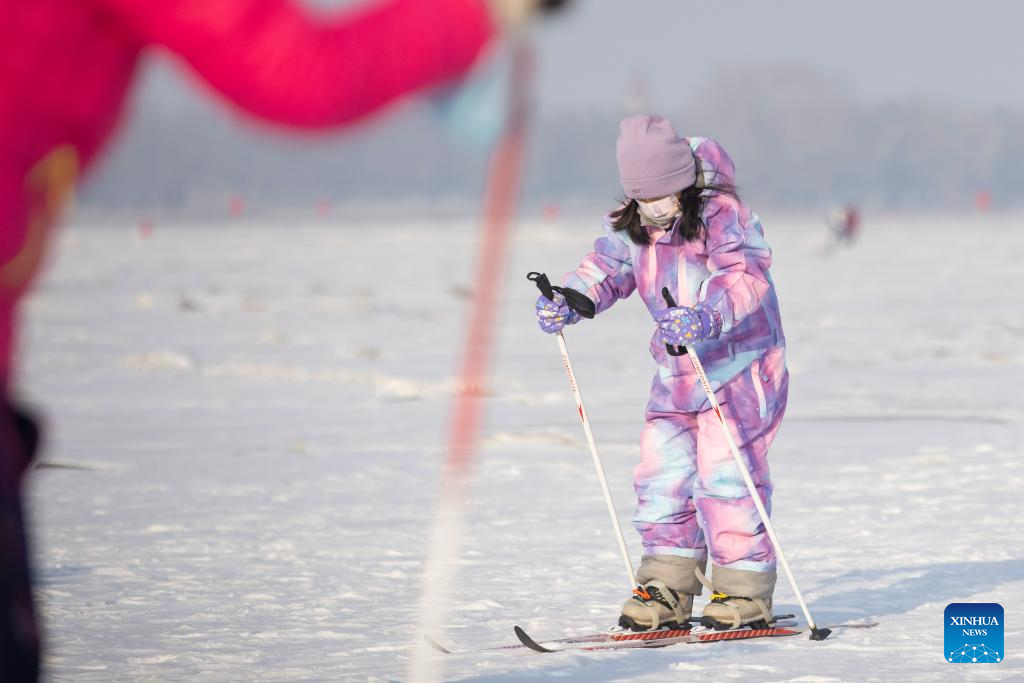 A skier is seen on a frozen river in Harbin, northeast China's Heilongjiang Province, Jan. 23, 2022. The upcoming Beijing 2022 Winter Olympic Games created an intense Olympic atmosphere in Heilongjiang, a major province of winter sports in China. (Xinhua/Zhang Tao)
