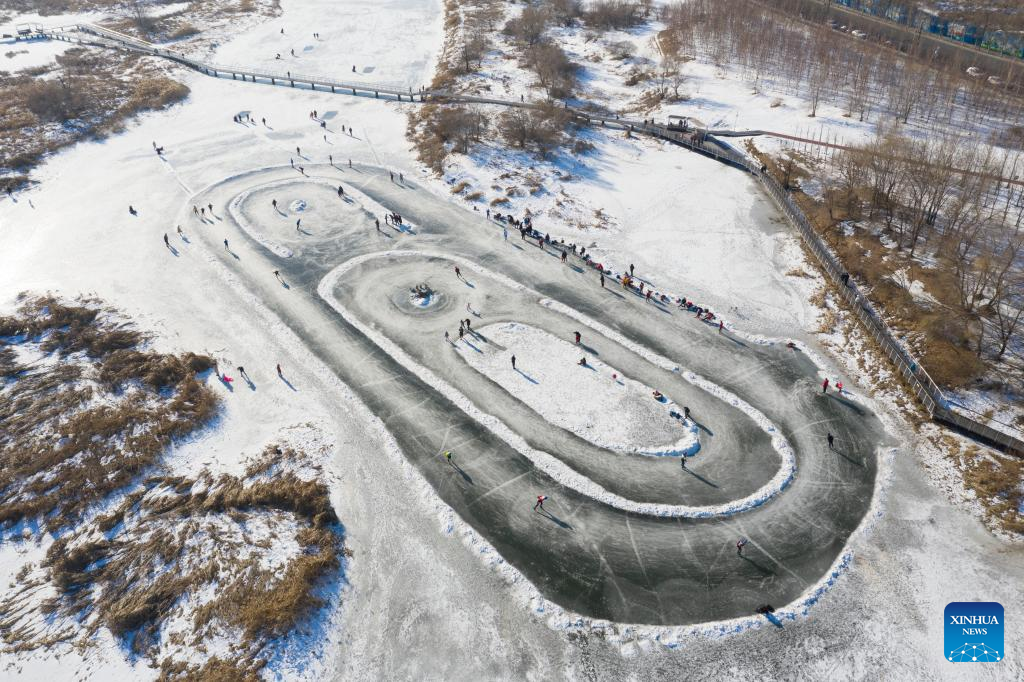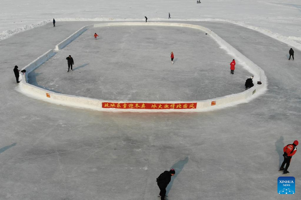 File photo taken with a drone shows people skate on an ice rink in Harbin, northeast China's Heilongjiang Province, Dec. 6, 2021. The upcoming Beijing 2022 Winter Olympic Games created an intense Olympic atmosphere in Heilongjiang, a major province of winter sports in China. (Xinhua/Xie Jianfei)
