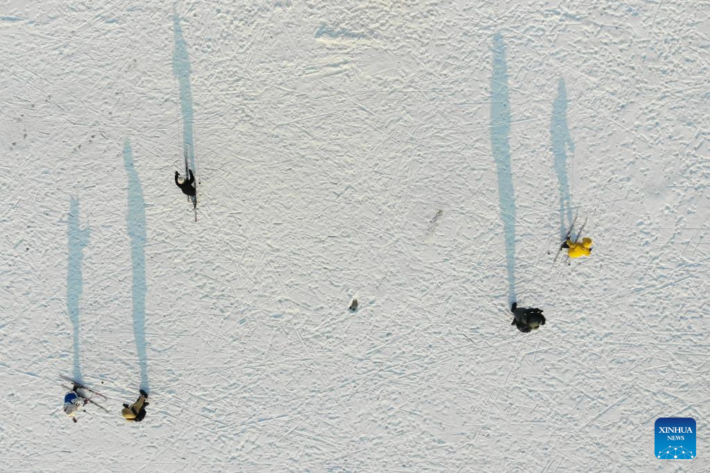 Photo taken with a drone shows skiers are seen on a frozen river in Harbin, northeast China's Heilongjiang Province, Jan. 23, 2022. The upcoming Beijing 2022 Winter Olympic Games created an intense Olympic atmosphere in Heilongjiang, a major province of winter sports in China. (Xinhua/Zhang Tao)
