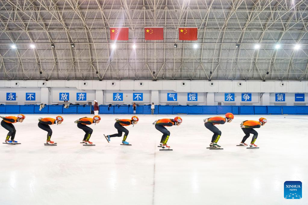 Students of a vocational college taking part in short track speed skating training at Qitaihe Sports Center in Qitaihe City, northeast China's Heilongjiang Province, Jan. 10, 2022. The upcoming Beijing 2022 Winter Olympic Games created an intense Olympic atmosphere in Heilongjiang, a major province of winter sports in China. (Xinhua/Zhang Tao)