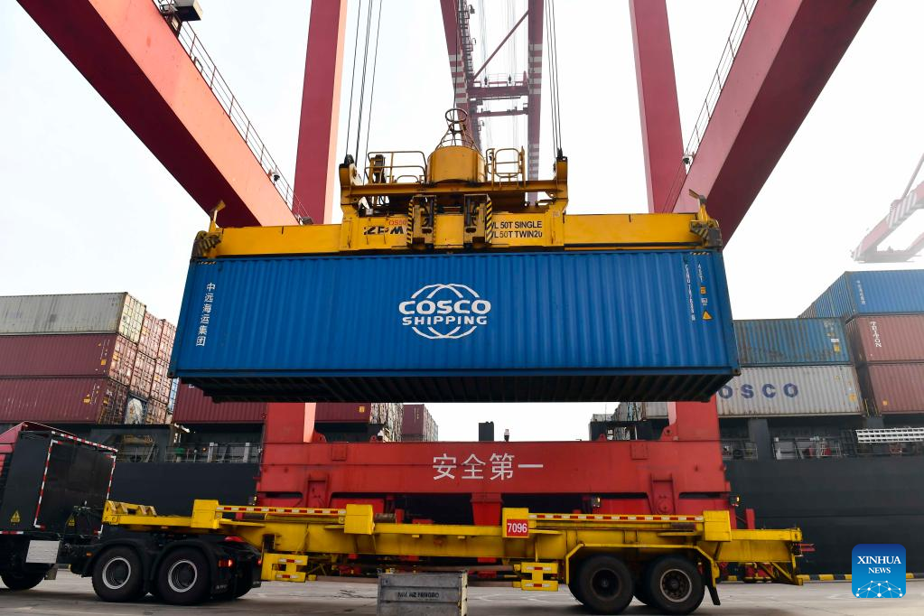 A container is loaded onto a truck at the Rizhao Port in Rizhao, east China's Shandong Province, Jan. 26, 2022. From Jan. 1 to 24, Rizhao Port of Shandong Port Group has completed a freight volume of 340,000 TEUs, a year-on-year increase of 21.4 percent; while the volume of international freight trains has increased by 81.5 percent year-on-year, making a good start. (Xinhua/Guo Xulei)