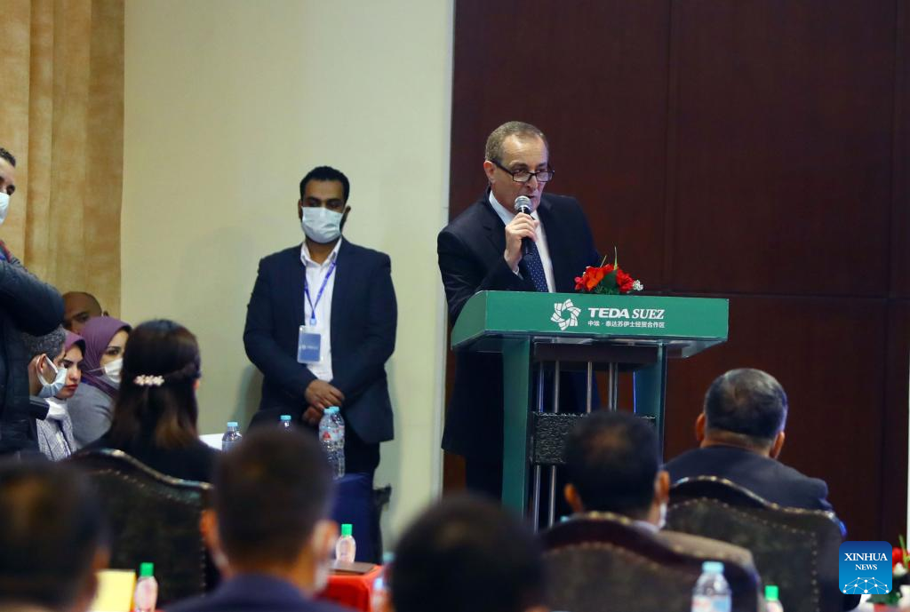 Mohamed Shabaan, vice-chairman of the Suez Canal Economic Zone (SCZone), delivers a speech during a celebration of TEDA's launch of new projects at the China-Egypt TEDA Suez Economic and Trade Cooperation Zone in Suez province, Egypt, on Jan. 25, 2022. Chinese giant industrial developer TEDA celebrated on Tuesday the successful launch of new projects on logistic services and used-car import in China-Egypt TEDA Suez Economic and Trade Cooperation Zone in northeastern Egypt. (Xinhua/Ahmed Gomaa)