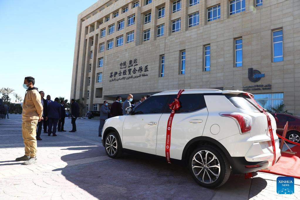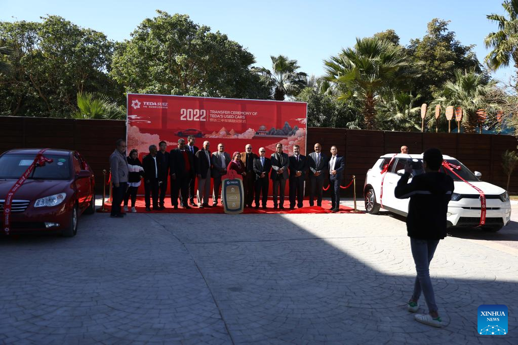 A used-car transfer ceremony is held during a celebration of TEDA's launch of new projects at the China-Egypt TEDA Suez Economic and Trade Cooperation Zone in Suez province, Egypt, on Jan. 25, 2022. Chinese giant industrial developer TEDA celebrated on Tuesday the successful launch of new projects on logistic services and used-car import in China-Egypt TEDA Suez Economic and Trade Cooperation Zone in northeastern Egypt. (Xinhua/Ahmed Gomaa)