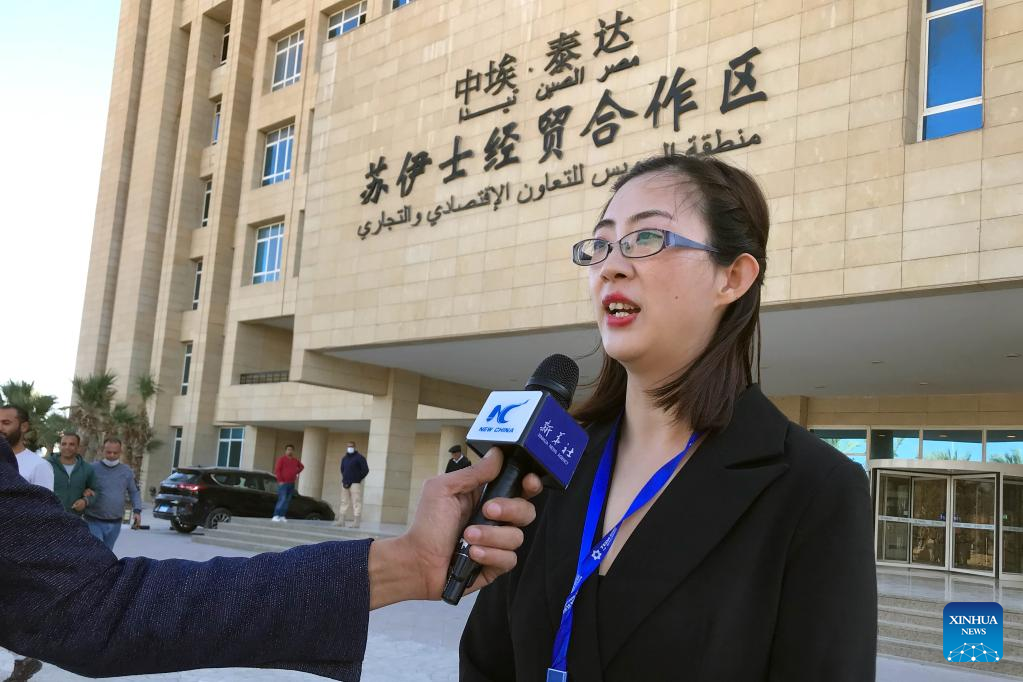Song Caicen, executive director of TEDA companies in Egypt, is interviewed with Xinhua during a celebration of TEDA's launch of new projects at the China-Egypt TEDA Suez Economic and Trade Cooperation Zone in Suez province, Egypt, on Jan. 25, 2022. Chinese giant industrial developer TEDA celebrated on Tuesday the successful launch of new projects on logistic services and used-car import in China-Egypt TEDA Suez Economic and Trade Cooperation Zone in northeastern Egypt. (Xinhua/Ahmed Gomaa)